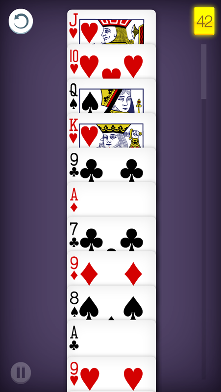 The goal is to clear as many cards as possible. You can clear a card it it is exactly one card away from another card that matches it in rank or suit. so in the example screenshot you could clear the 7♣ because it is one away from another club (the 9♣). When you clear a card it goes away and the stack compresses. The game ends when you can’t clear any more cards. You get a score that is based on which cards you cleared, with higher ranks being worth more points, and a multiplier which is based on how many total cards you cleared.