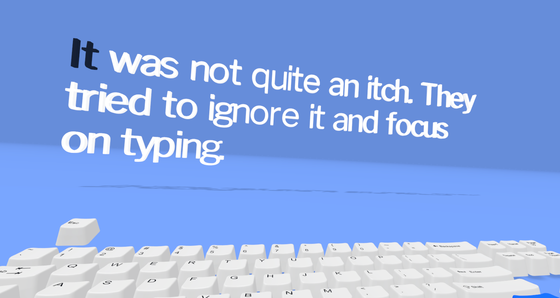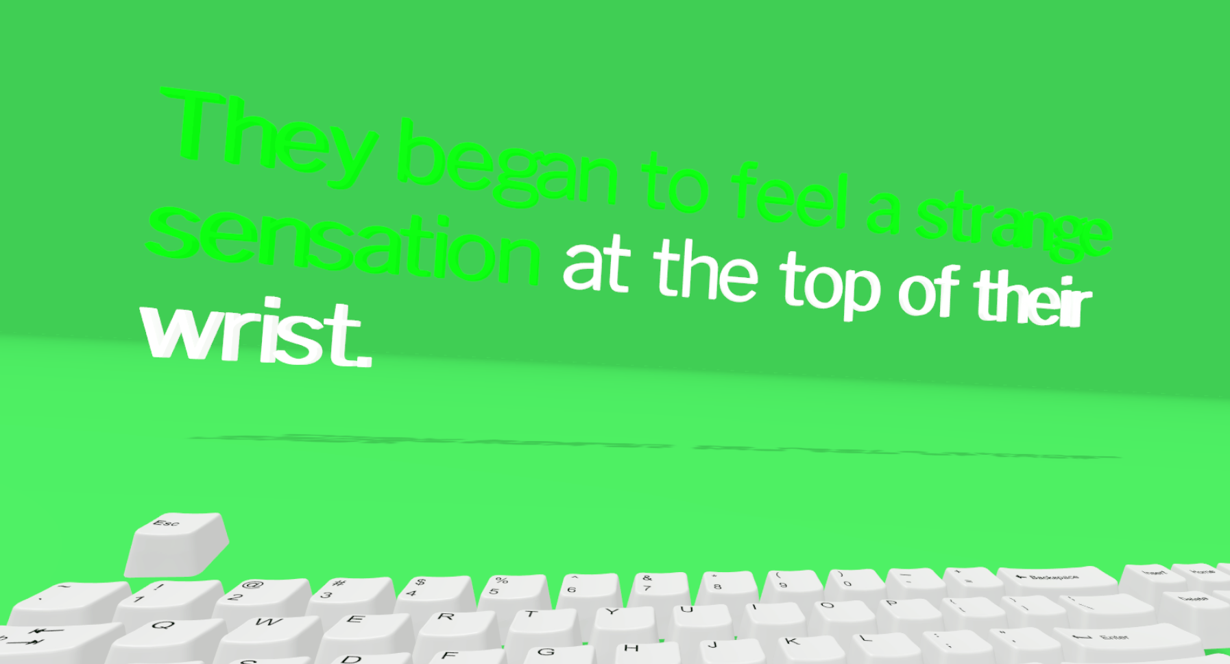 “Metametamorphosis” is a stripped-down, minimalist gesture that calls attention to both the platform and medium by removing visual and somatic noise from the user’s field of experience, allowing them sufficient space to reflect on the materials around them. The piece is as much about the shapes and forms of the words themselves, their positioning and size and color, as it is about the story itself; as with concrete poetry, the materiality of the work is integral to the meaning that it generates. Too, we chose to remix a well-known piece of surrealist, existentialist literature in an effort to connect to, and update, the source material’s phenomenological concerns.